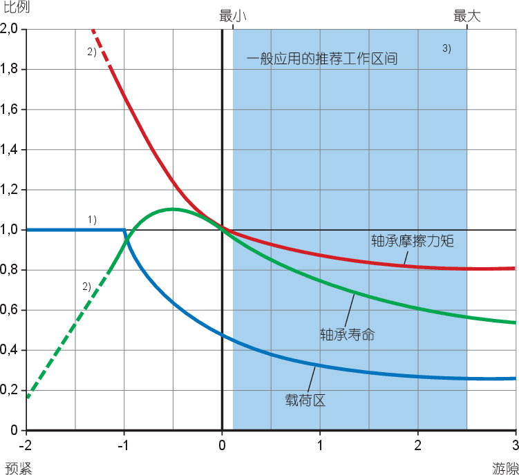 SKF轴承的工作游隙或预紧可以影响摩擦、载荷区的大小和疲劳寿命等。 图1显示这些参数之间的关系。 图表的生成基于径向载荷下的SKF轴承。