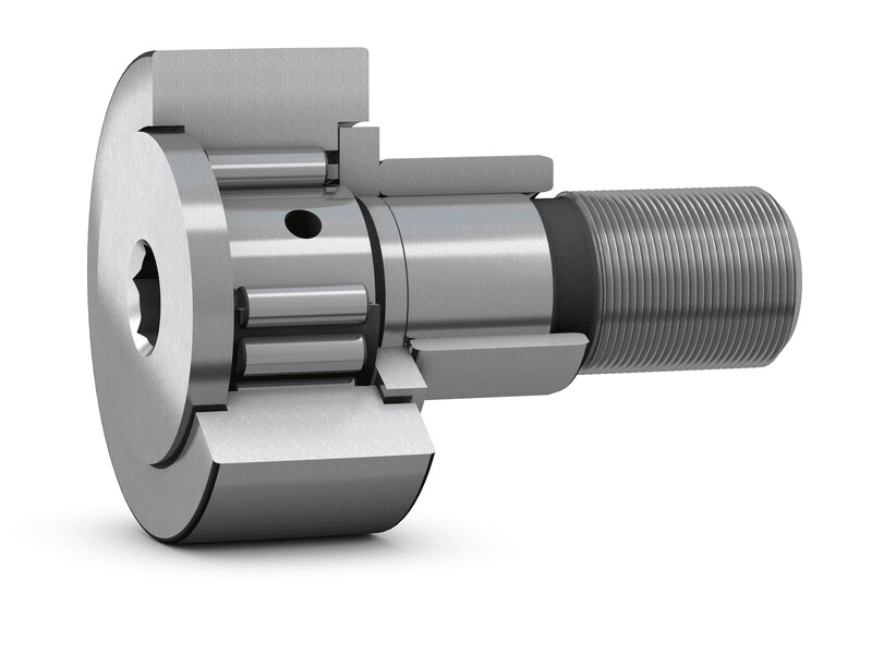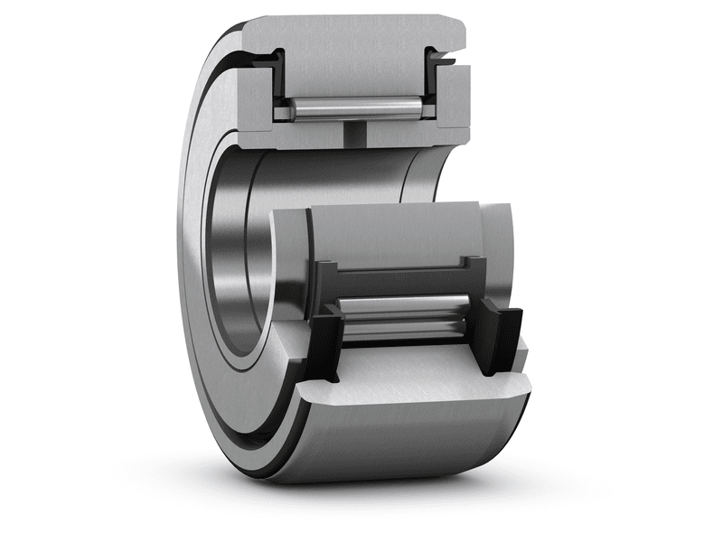 SKF滚轮轴承 滚轮轴承可在所有类型的轨道上运行,并用于凸轮驱动、输送系统等。 外圈运行表面形状标配为凸球面。 除了单列凸轮滚子轴承以外,滚轮轴承还可配备圆柱面(平直的)外圈运行表面。 SKF 提供的滚轮轴承已填充润滑脂,并带有密封,可随时安装。 它们拥有多种类型和设计形式,并且可用于各种运行条件和应用。 其类型涵盖: 凸轮滚子轴承(基于球轴承的轭式滚轮轴承图 1、图 2) 支撑滚子轴承(基于球轴承的轭式滚轮轴承图 3) 凸轮从动轴承(基于球轴承的螺柱式滚轮轴承图 4) 图 1 图 2 图 3 图 4 滚轮轴承特点 可承受高径向载荷 厚外圈壁能够承受高径向载荷,同时减少变形和弯曲应力。 使用寿命长 凸度外圈运行表面对于可能发生外圈相对于轨道倾斜或者需要最小化边缘应力的应用是有益的。