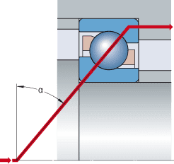 角接触球轴承的轴向承载能力随着接触角的增加而增加。 在径向平面上,钢球和滚道接触点的连线(即组合载荷从一个滚道传递到另一滚道的方向)与轴承轴线垂直线的夹角