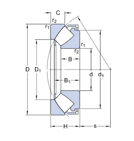 SKF球面滚子推力轴承拥有特殊设计的滚道和不对称滚子。 SKF轴承可以承受沿一个方向作用的轴向载荷和同时作用的径向载荷。 载荷在滚道之间通过与轴承轴线成一定角度的滚子传递,而挡边引导滚子。